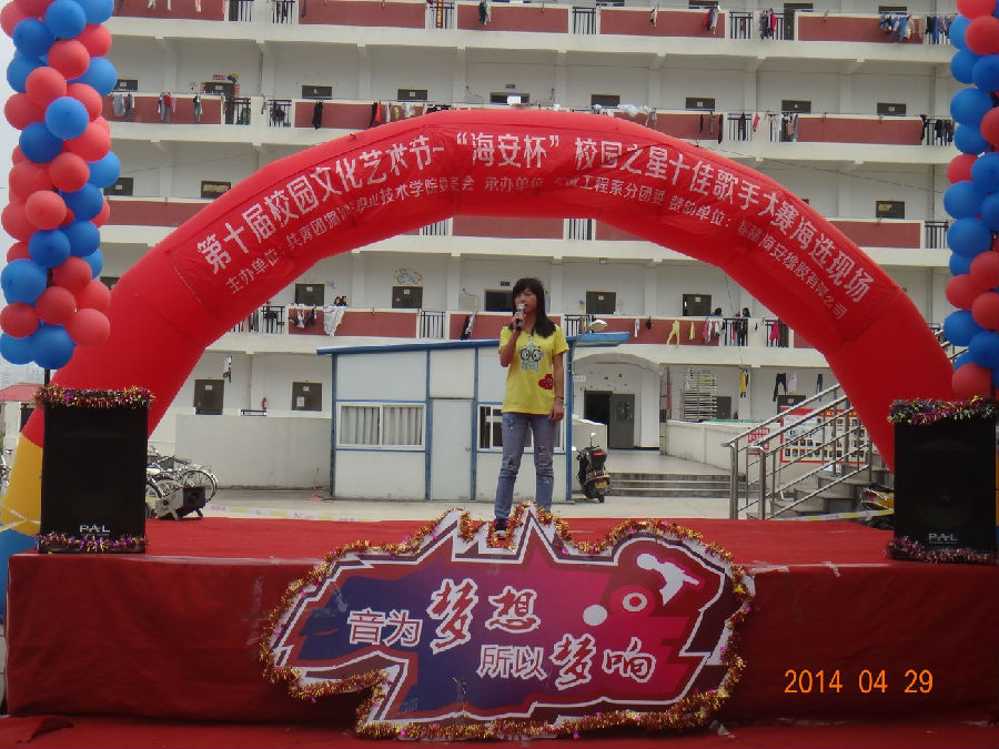 渐入初夏的校园有了点点热意,2014年4月29日下午两点,在秋食园食堂门口,第十届校园文化艺术节“海安杯”校园之星十佳歌手大赛海选下半场中,歌手们的激情又被点燃,火爆的音乐和张扬的个性,驱走了心中的热意,将天空画得一片炫彩。