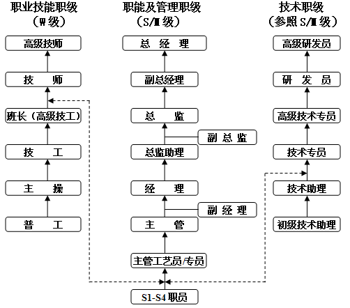 公司结合公司职级管理规划以及员工自身职业发展潜力,指导员工按直线晋升或横向交叉轮岗晋升模式,找到同公司共同发展平台。