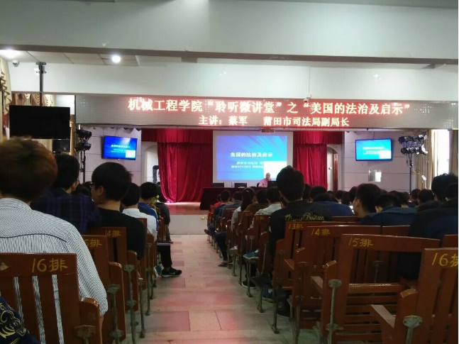 为传播法治文化,弘扬法治精神,“12.4国家宪法日暨全国法制宣传日”到来前夕,机械工程学院邀请莆田市司法局蔡军副局长到学校为全体同学开展“聆听微讲堂”之法治专题讲座,讲座主题为“美国的法治及启示”。
