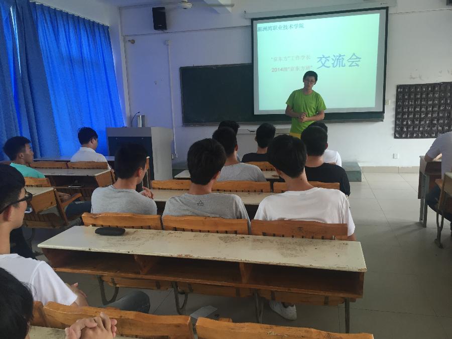 来自重庆京东方的刘宫旭学长介绍了在京东方的学习、生活、工作经历,对企业感到新鲜的2014级“京东方班”学员们咨询了许多关于公司的问题,其中包括工资待遇、食住条件、工作条件、工作环境、倒班情况、周边环境及发展空间等。当刘宫旭学长谈到公司提供免费无限量自助工作餐时,作为吃货的这群学员们已经静不下来,蠢蠢欲动马上要动身去企业了。