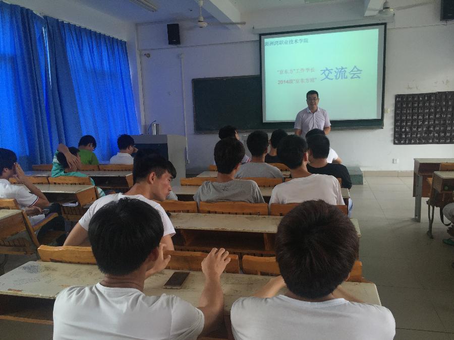 当前位置: 系部首页>最新消息6月15号,在“京东方班”即将踏上赴企业培训及顶岗实习之际,班主任林志荣老师组织了一场关于了解京东方的主题交流会。在主题交流会上,邀请了两位在“京东方”工作的学长,即来自重庆京东方的刘宫旭学长,以及来自安徽合肥京东方的陈晓文学长。