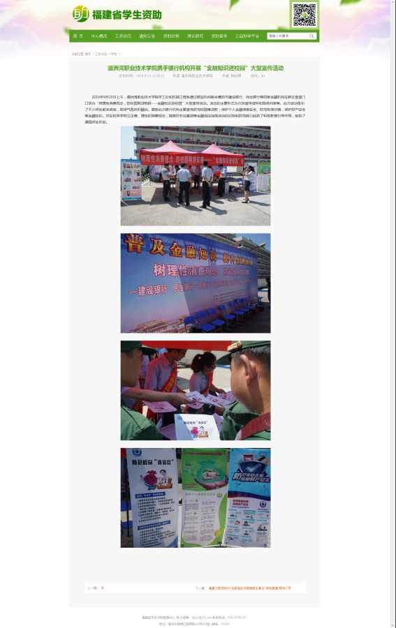 当前位置: 系部首页>最新消息2016年9月19日上午,学院学工处、机械工程学院通过莆田市银监局牵头莆田市建设银行、民生银行、农商银行、厦门国际银行等四家金融机构在新区食堂门口举办“树理性消费观念,防校园网贷陷阱——金融知识进校园”大型宣传活动。活动的主要形式为分发宣传资料和现场问答等。此次活动吸引了不少师生前来咨询,现场气氛热烈融洽。据悉此次银行机构主要宣传防范校园毒贷款;保护个人金融信息安全、防范电信诈骗,保护财产安全等金融知识。对在校同学树立正确、理性的消费观念,提高对非法集资等金融违法违规活动的识别和防范能力起到了积极教育引导作用,受到了湄园师生欢迎。