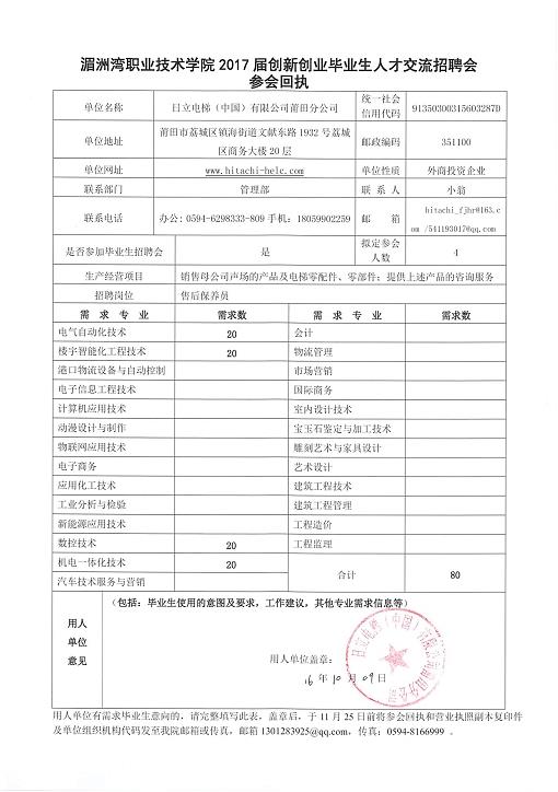 日立电梯(中国)有限公司莆田公司2017校园招聘