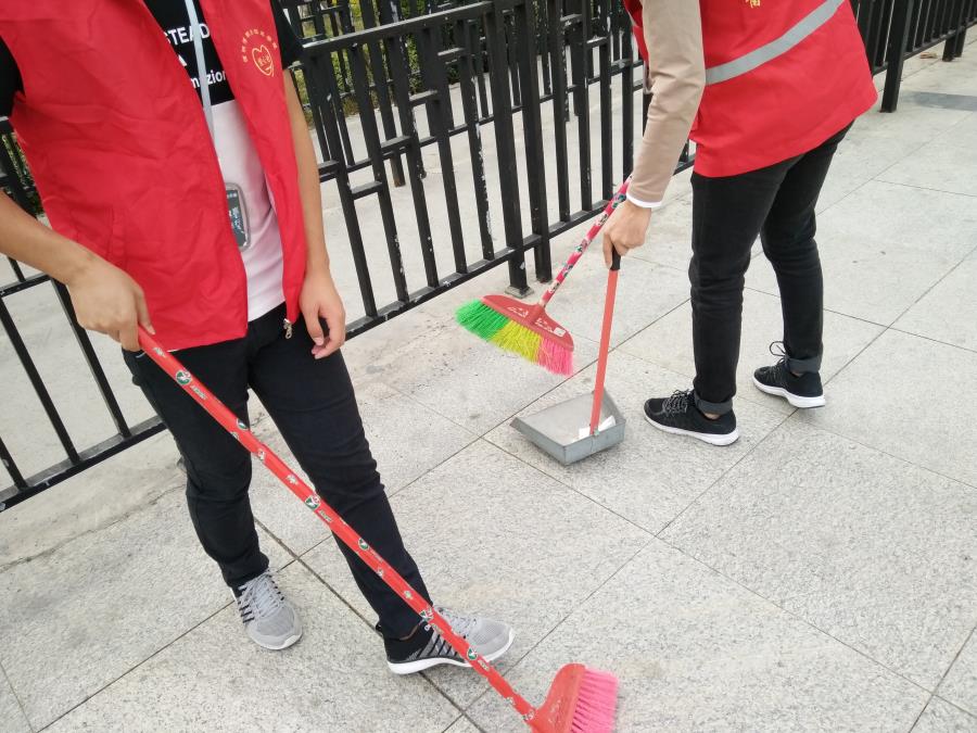 小伙伴们正在为动车站周边进行打扫卫生