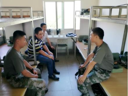 走访慰问期间,几位老师与连队领导及入伍大学生座谈,李处长介绍了学校征兵工作方法措施,并听取了连队领导对陈言镇同学在部队服役情况的介绍和评价。他鼓励学生在部队刻苦磨练,积极表现。随行人员也与陈言镇进行了交流,了解了学生在入伍前后的思想动态、生活、训练情况以及对考学和复学等重要问题上的想法及主要困难。老师们还专门到营房、食堂等地了解体验。此次慰问的陈言镇同学是2014年入伍的,在部队的表现得到部队领导的肯定,获得“优秀士兵”称号,并通过考核晋升为士官。
