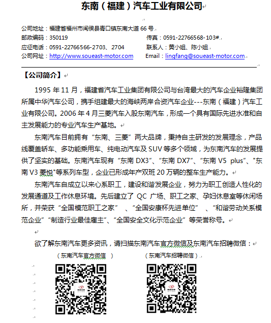 东南(福建)汽车工业有限公司招聘信息