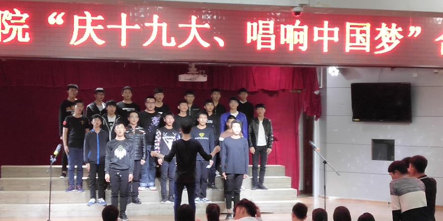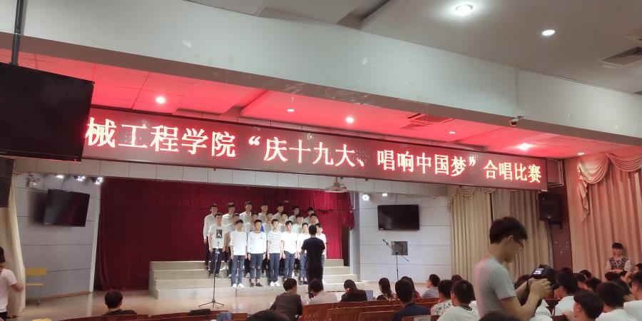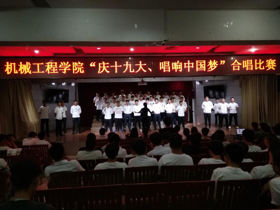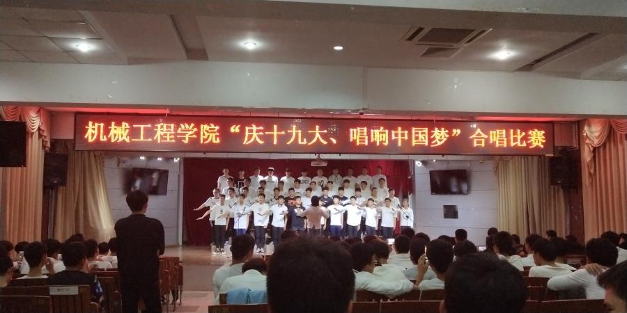 当前位置: 系部首页>最新消息为全面贯彻落实党的十九大精神,11月6日晚,由机械工程学院学生党支部、分团委学生会举办的“庆十九大,唱响中国梦”合唱比赛在17号楼201教室举行,学工处林俊副处长、机械学院李仲清副主任、许志敏副书记出席了这次活动,基础部音乐教研室的邹祎程、翁歆两位老师以及黄剑萍、林伟岭、朱涵三位辅导员担任此次比赛的评委。