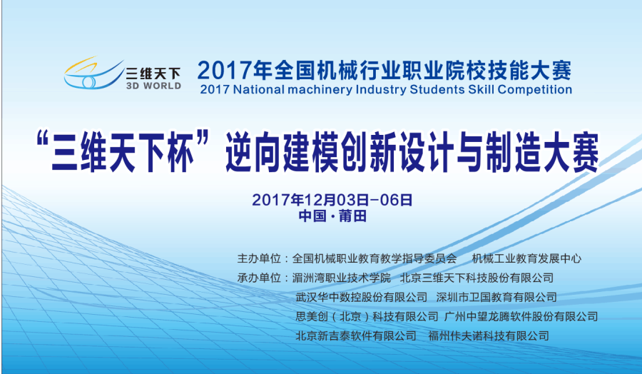 当前位置: 系部首页>最新消息2017年全国机械行业职业院校技能大赛高职组——“‘三维天下杯’逆向建模创新设计与制造”赛项将于2017年12月3日-6日在我院举办,这是我院首次承办全国机械行业职业院校技能大赛。本次大赛采取“数据采集+逆向建模创新设计+五轴联动加工技术”相组合方式,根据职业院校师生特点,结合三维扫描与逆向建模设计技术、高端多轴数控加工的技术要求设置大赛内容,主要检验师生掌握相关先进制造技术的能力,考核三维扫描、逆向建模创新设计能力以及高端五轴联动加工技术等。赛项设置上突出了服务国家战略,对接产业发展,赛项内容上强调服务专业和教学,突出以赛促教。据了解,本赛项共有来自全国20个省市的59个院校的参赛。