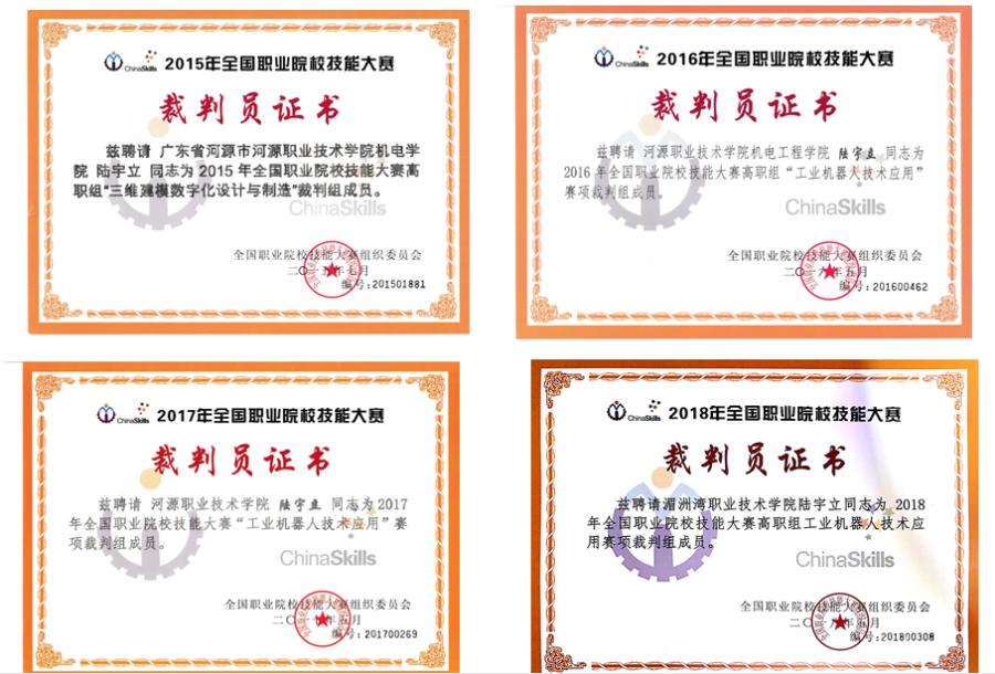 机械工程系主任陆宇立作为专家连续四年参与全国职业院校技能大赛国赛裁判工作,并连续3年担任高职组“工业机器人技术应用”赛项国赛裁判工作,先后担任广东、福建、重庆、陕西等多省大赛专家组组长和裁判长。指导学生参加各类省级、国家级技能竞赛三十多次,获国家级一等奖3个、二等奖3个、三等奖5个、省级各类大赛奖励二十余个。