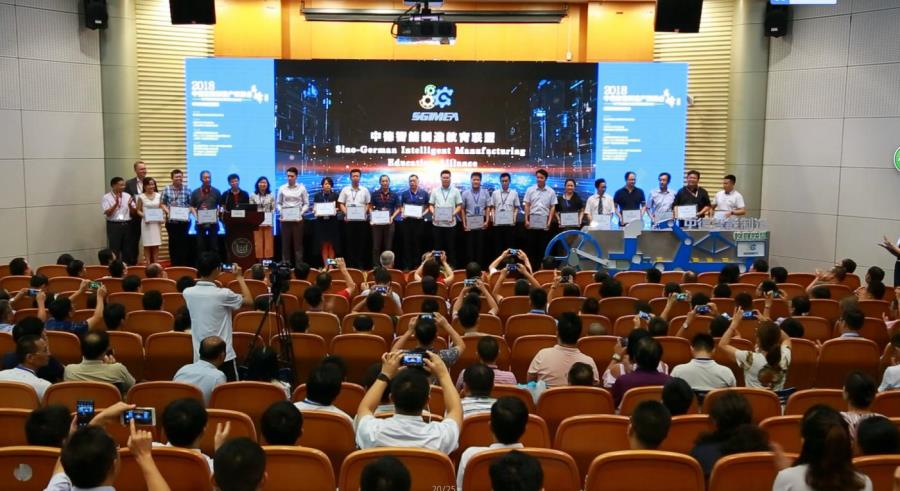 当前位置: 系部首页>最新消息以全国机械职业教育教学指导委员会为指导单位,同济大学中德工程学院、同济大学职业技术教育学院联合中德智能制造教育联盟举办“2018中德智能制造产教融合高峰论坛”。机械系工程系赵庆新、林占光、关昕晓三位老师赴上海同济大学参加“2018中德智能制造产教融合高峰论坛暨中德智能制造教育联盟成立大会”。本次论坛邀请德国工程师协会、德国工业4.0标准制定委员会、PHOENIX CONTACT、KUKA、沈阳机床集团等智能制造企业与专家代表,及智能制造专业群各大院校专家学者发表演讲,也为智能制造搭建人才培养探索、前沿技术探讨、学术交流、信息共享、成果展示的活动平台。
