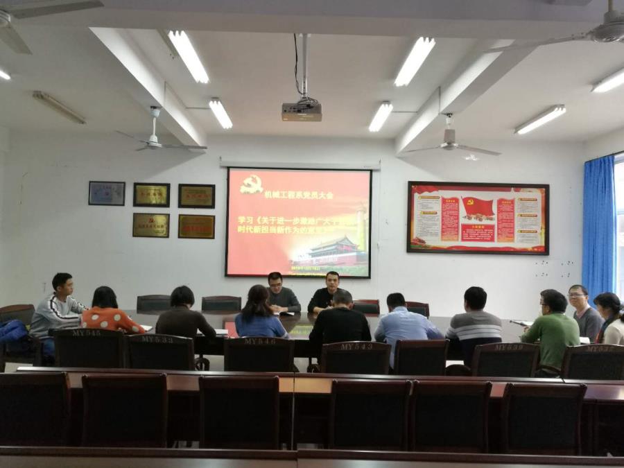 10月16日下午,机械工程系于党员活动室召开主题党日活动,本次的主题是学习《关于进一步激励广大干部新时代新担当新作为的意见》。会议由教工党支部书记张星同志主持,全体党员参会。