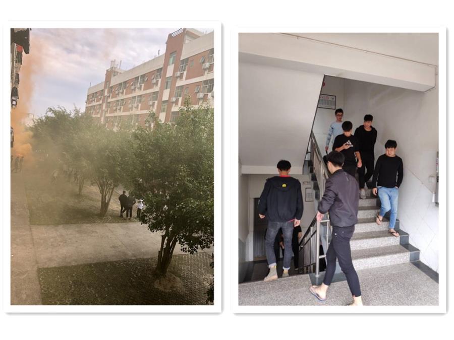 演练结束后,集合点书记对整个演练过程的学生表现给予肯定,但是也指出部分同学稀拉懒散的行为,最后希望各位同学,通过此次的演练,提高应急突发火灾地震事件的处理能力。