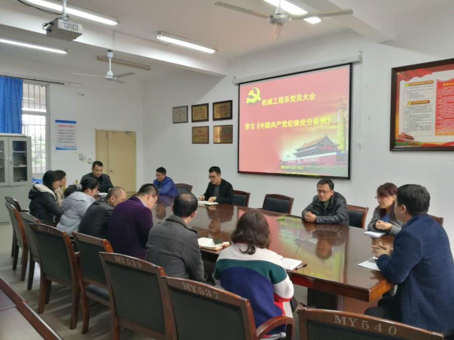 当前位置: 系部首页>最新消息12月18日下午,机械工程系教工党支部召开全体党员会议,专题学习《中国共产党纪律处分条例》,增强“不敢腐、不能腐、不想腐”的思想行动自觉。会议由教工党支部书记张星同志主持。