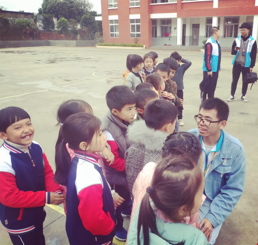 也许是被志愿者们的热情感染,天渐渐放晴,志愿者们带领小朋友们来到操场玩起游戏。这边在玩老鹰抓小鸡,那边在玩一二三木头人。欢声笑语充满了操场的每个角落,小朋友们的童真也感染着每一个志愿者。