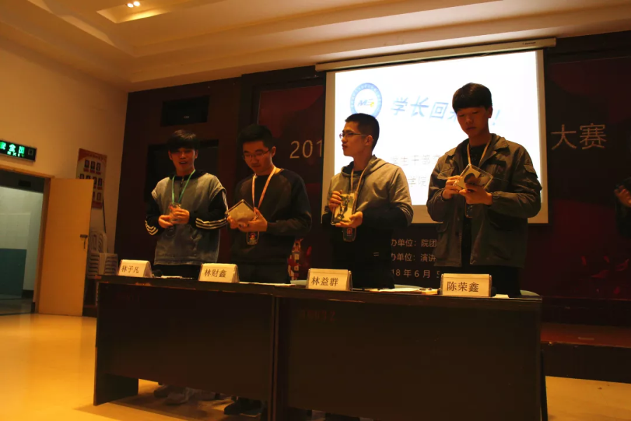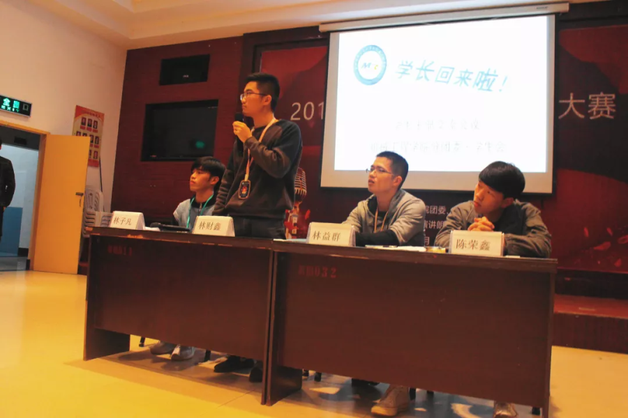 翁歆老师向我们一一介绍了到场的学长:第十一届学生会主席—林财鑫学长;第十二届学生会主席—陈荣鑫学长;第十二届学生会副主席—林益群学长;第十三届学生会文娱部部长—林子凡学长。