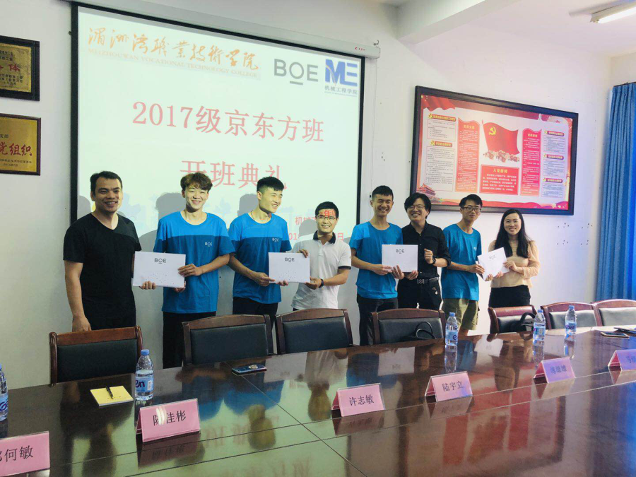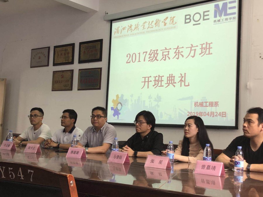 当前位置: 系部首页>最新消息为了推动校企合作内涵,推动产教深度融合,丰富顶岗实习内容,与福州京东方光电科技有限公司良好的校企合作基础上,机械工程学院2017级“京东方班”于04月24日正式开班,本期共有43位学生。开班典礼由京东方人事部傅雄雄科长、马倩钰经理,机械系主任陆宇立、副主任许志敏、校企办主任张星、系辅导员及“京东方班”学生共同出席。