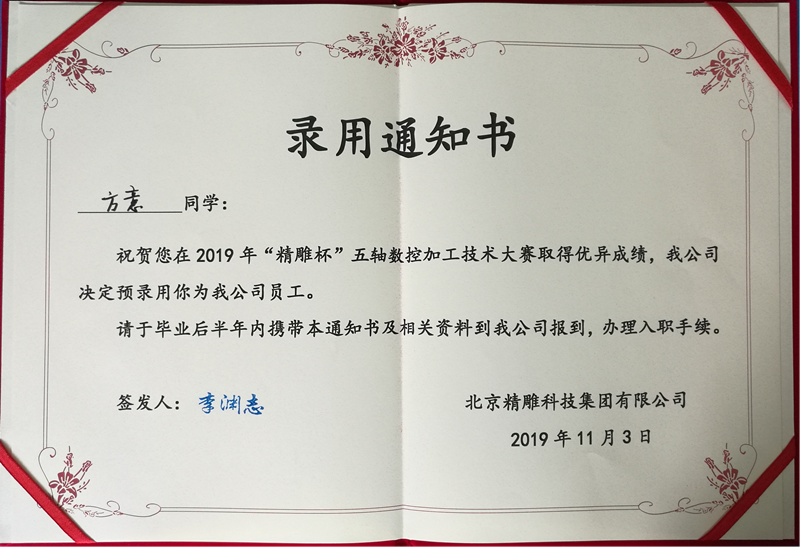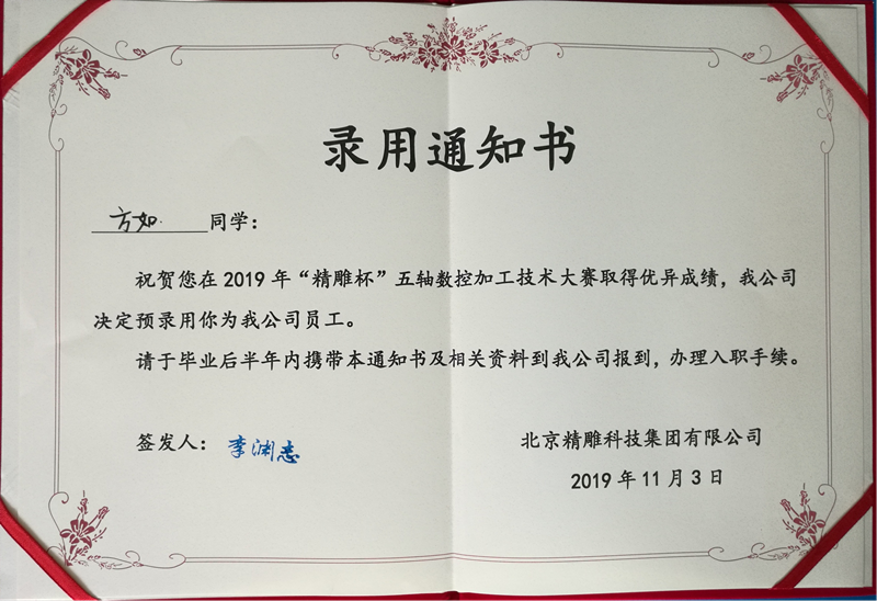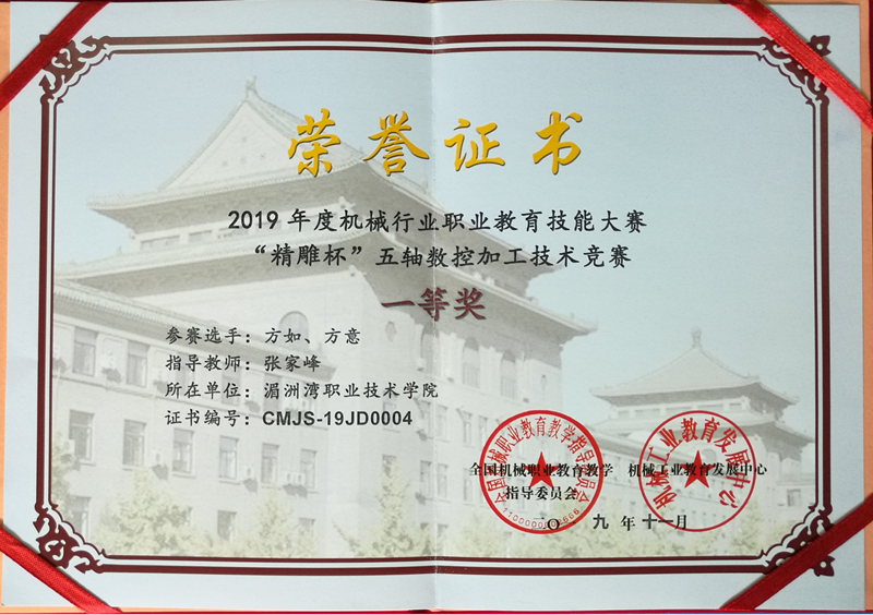 当前位置: 系部首页>最新消息2019年10月31日—11月3日,由机械工业教育发展中心,全国机械职业教育教学指导委员会主办的2019年“精雕杯”五轴数控加工技术大赛在广东东莞举行,来自全国16个省44所院校的52支师生队伍汇聚一堂,同台竞技。我院学生方如、方意经过长时间的刻苦训练、团队合作认真备赛,此项目突破性地获得了全国一等奖的好成绩。两位同学在比赛中表现出色,直接获得了北京精雕科技集团有限公司的录用证书。同时,张家峰老师还被评为2019年度机械行业职业教育技能大赛优秀指导教师。