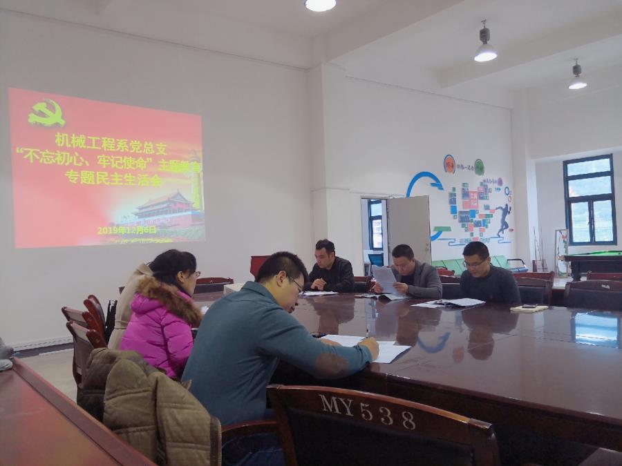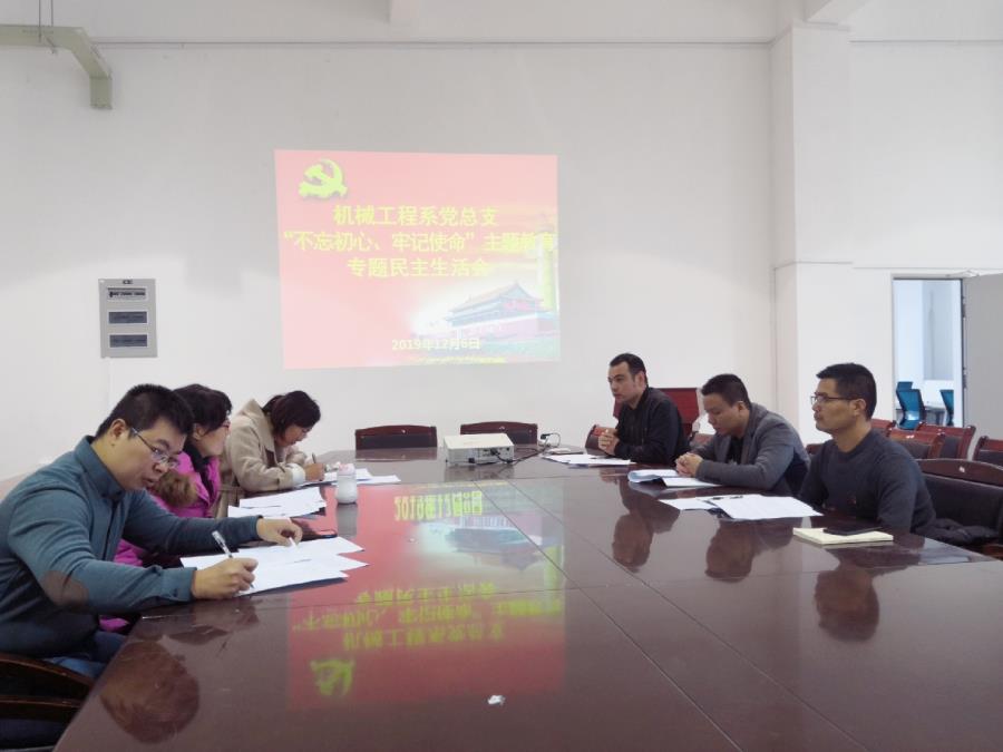 当前位置: 系部首页>最新消息根据“不忘初心、牢记使命”主题教育活动要求及学院的部署安排,机械工程系党总支于2019年12月6日上午在机电楼党员活动室召开专题民主生活会,学院主题教育指导组张智佳同志到会指导,会议由党总支书记许志敏同志主持,全体党总支委员参加会议。