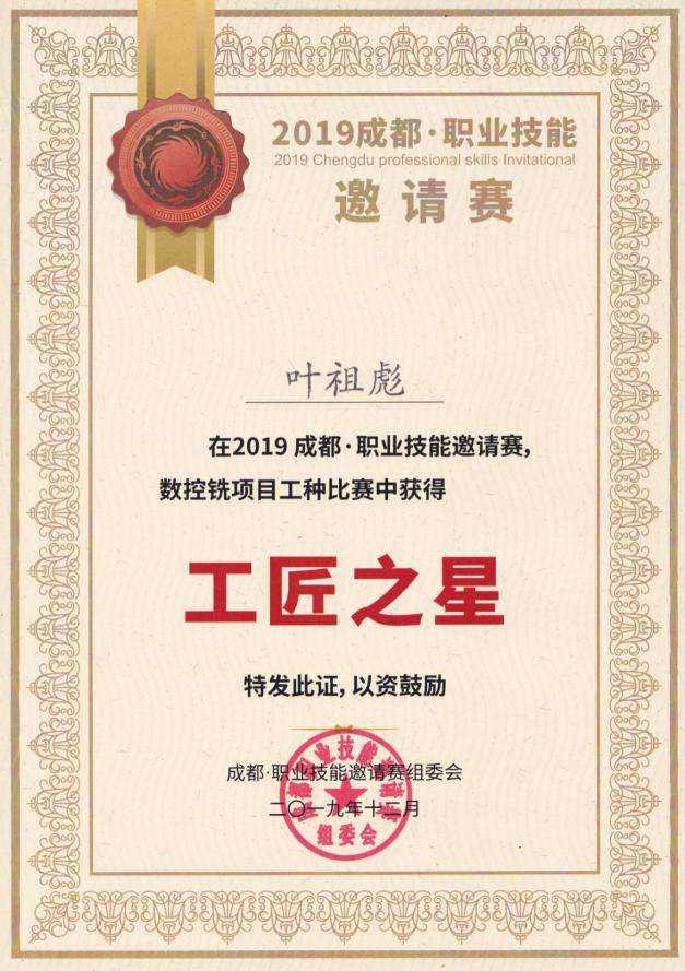 当前位置: 系部首页>最新消息12月13日,由成都市人民政府主办,成都市总工会、成都市人社局、四川天府新区成都管委会承办的“2019成都·职业技能邀请赛”圆满地落下了帷幕。来自北京、上海、广州、深圳等全国66个城市的1042名优秀技能选手积极参与,通过盾构机施工技术比赛、5G+物联网技术比赛、数控铣项目比赛、无线电装接工项目比赛、焊接项目比赛这五大赛项,相互交流切磋,展开了一场为期3天的职业技能大比拼,赛出了各自的专业水准,展现了新时代优秀技能人才的风采。经过三天的激烈角逐,我院选手叶祖彪在数控铣赛项中以院校组第四名的成绩荣获“工匠之星”奖,张家峰老师荣获“优秀指导教师”称号。