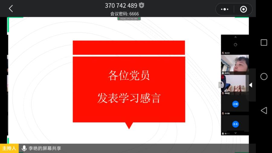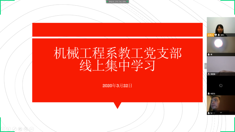 当前位置: 系部首页>最新消息为进一步提高党员教职工的政治理论水平,根据系部党总支的学习工作安排,结合当前防疫工作的特殊性,我系教工党支部于2020年3月22日举行线上集中学习活动。学习活动由组织委员李艳同志主持,全体党员参加了此次活动。