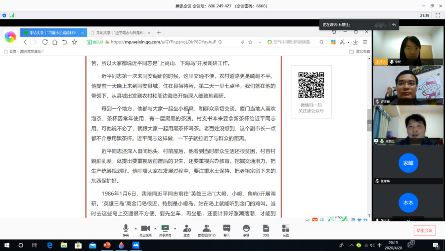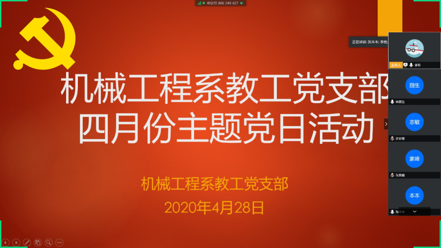 当前位置: 系部首页>最新消息2020年4月28日,机械工程系教工党支部在线上举行四月份主题党日活动。本次活动由组织委员李艳同志主持,教工支部全体党员参加了此次活动。