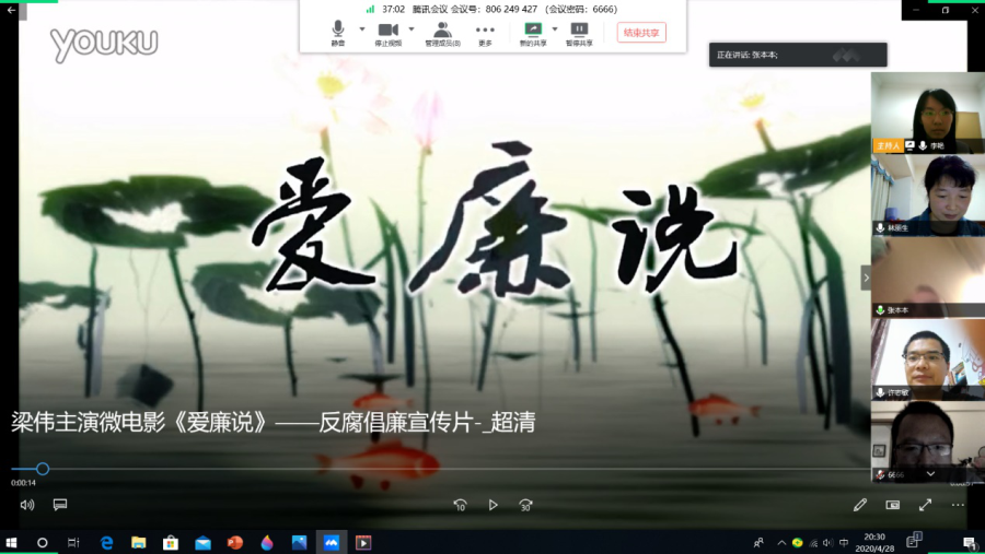 首先,大家利用腾讯会议端集中观看了反腐倡廉宣传片《爱廉说》,微电影以莲花的“莲”与廉洁的“廉”同音而构思,以莲花作为主题前后呼应。讲述了一个正直的干部,人情世故而使自己陷入了惶恐不安的心里压力中。通过及时反省纠错,才使自己从诱惑中解脱。故事阐述了当今社会廉政建设的重要性和必要性,给我们深刻的启迪和教育。爱莲、修心,爱廉、养性。