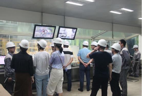 图为与会人员参观冷轧生产车间的总控室并与校友交流