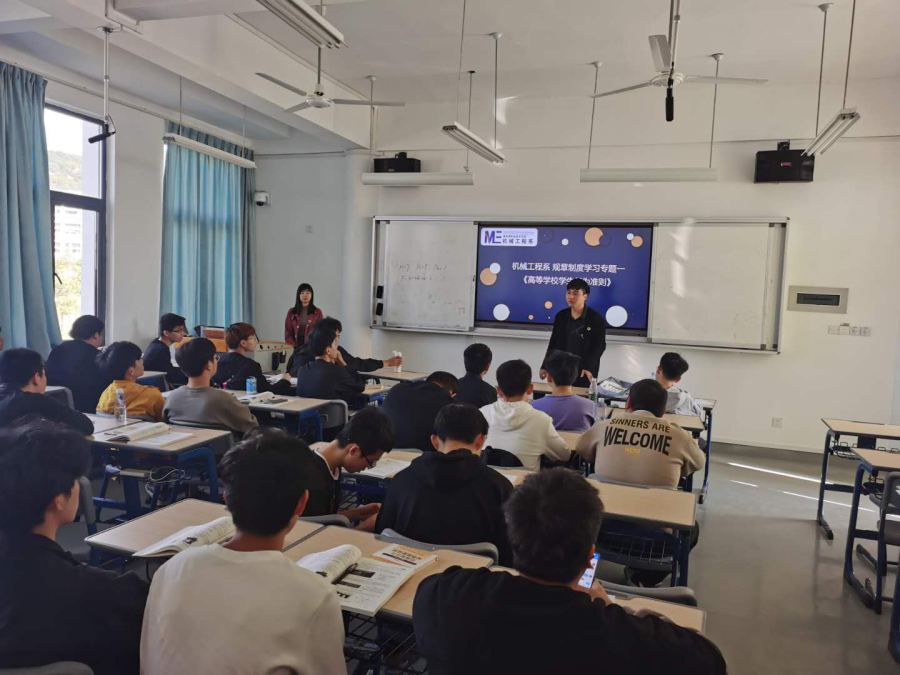 当前位置: 系部首页>最新消息为了增强学生对学院的管理服务规章制度的认识,促进校风、班风建设。机械工程系于2020年10月20日,在公教一北教室开展“懂制度,守规章”《学生教育管理服务规章制度》学习主题教育。参加本次主题学习的有辅导员曾嘉靖、朱菡、邱淑娇、机械工程系2019级学生以及2020级学生。