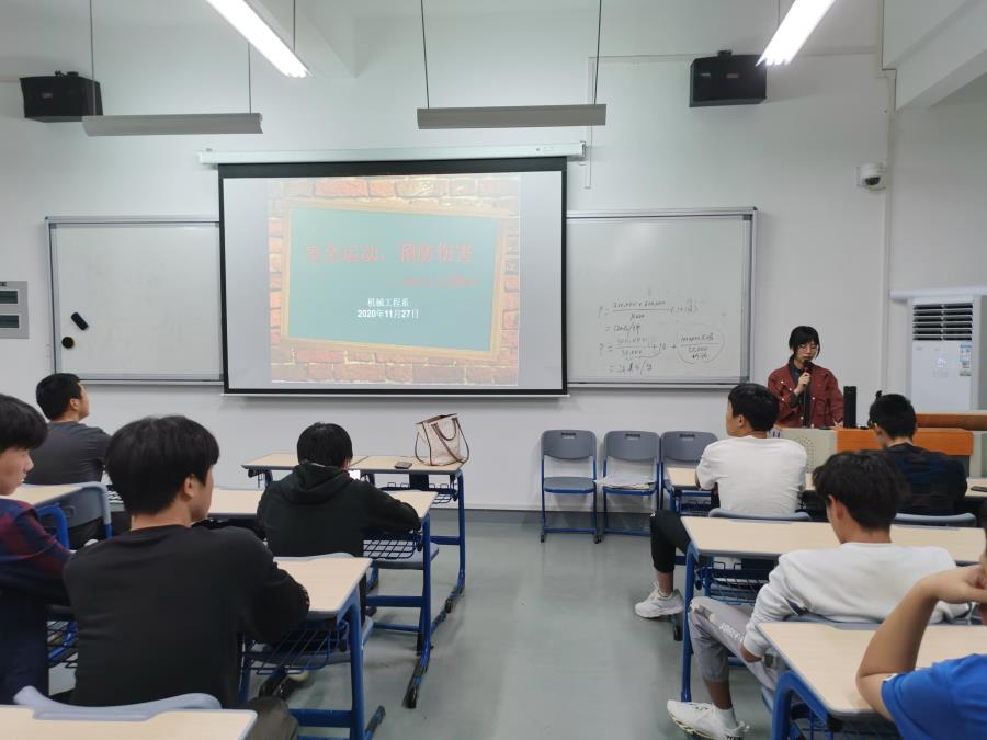 当前位置: 系部首页>最新消息 合理的运动可以增强身体素质,让人保持青春活力,还可以缓解压力,令人身心畅快,由于运动的特殊性,运动也存在一些安全隐患。运动会在即,为了提高同学们的安全意识,2020年11月27日机械工程系2019级学生于公教一北204开展“安全运动,预防伤害”运动安全主题班会,会议由辅导员朱菡主持。 首先辅导员介绍了的运动损伤产生的原因,并通过视频形象的向同学们不同损伤的处理方法以及如何预防运动中出现的伤害,让同学们学到了一些安全知识,并认识到日常运动过程中防范于未然的重要性和生命的脆弱和可贵,及时的为同学们敲醒了安全的警钟。 此次主题班会的召开,让同学们认识到安全运动的重要性,加强的自身安全防范能力,促进了的安全校园的建设。
