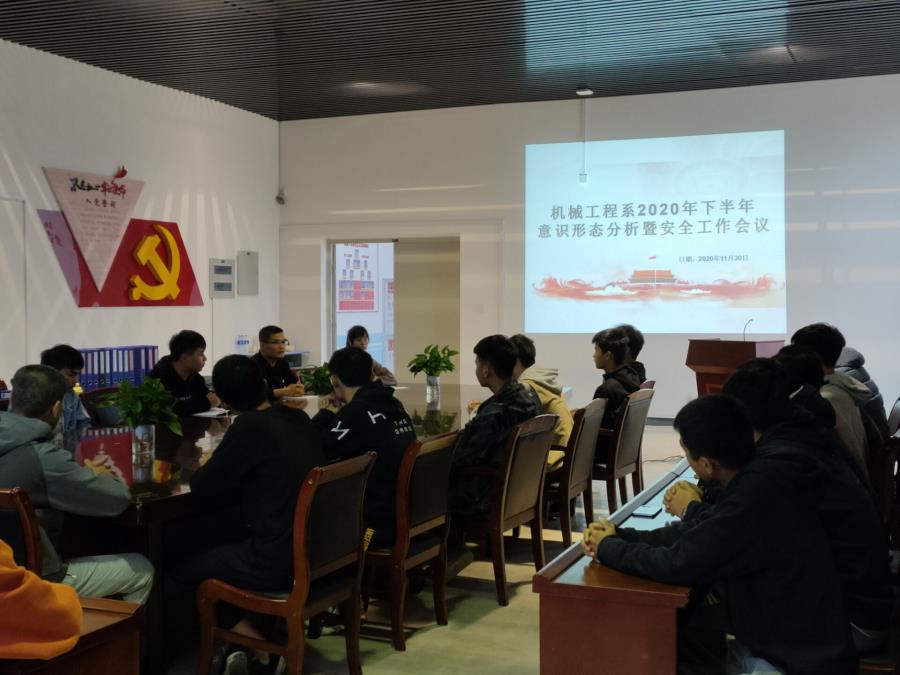 当前位置: 系部首页>最新消息2020年11月30日下午,我系于机电实训楼四楼会议室召开2020年下半年意识形态分析暨安全工作会议。系部组织员黄剑萍,辅导员朱菡、曾嘉靖、邱淑娇,各班班长、团支书参加本次会议,会议由系党总支书记许志敏同志主持。