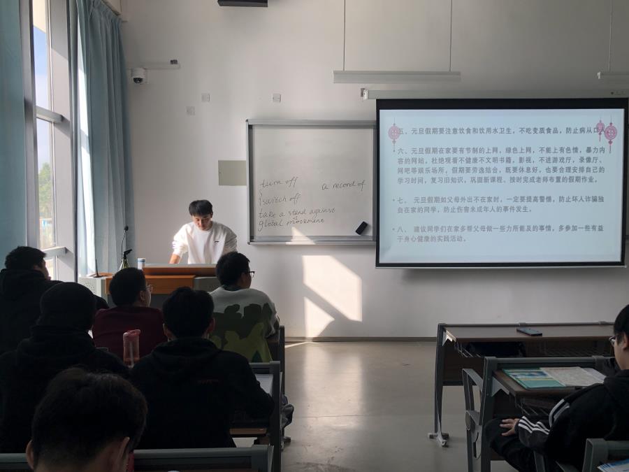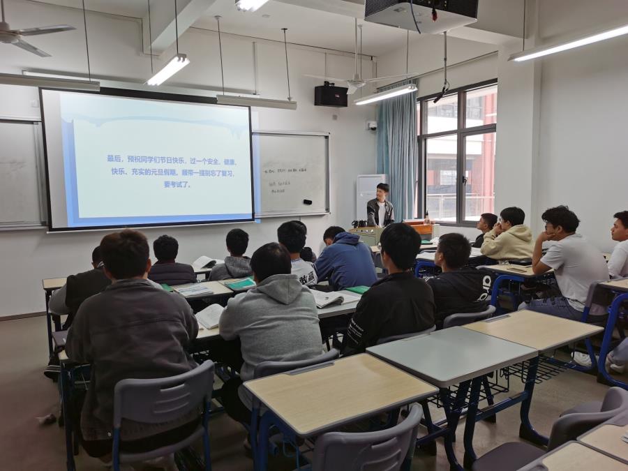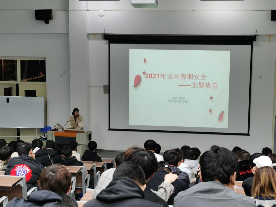 当前位置: 系部首页>最新消息元旦假期即将来临,为增强学生安全意识,让我系师生过一个愉快而又充实的假期,杜绝假期期间学生一切非正常事故的发生。2020年12月24日,机械工程系在信息楼南205、公教一楼等各教室开展了元旦假期安全主题教育活动,各会议由辅导员朱菡及各班级班长主持。