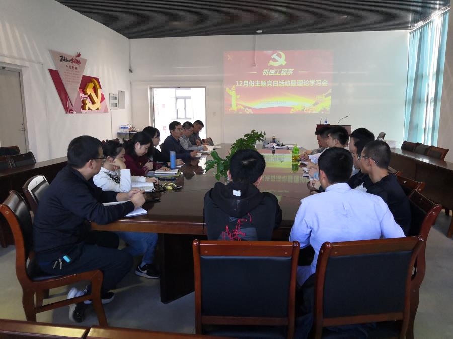 当前位置: 系部首页>最新消息为深入学习贯彻习近平新时代中国特色社会主义思想和党的十九届五中全会精神,强化理论武装,不断提高党员理论水平和工作能力,加强党员思想政治建设。2020年12月29日下午,机械工程系学生党支部、教工党支部在机电楼党员活动室联合开展十二月主题党日活动暨理论学习会,会议由党总支书记许志敏主持,全体党员参会。