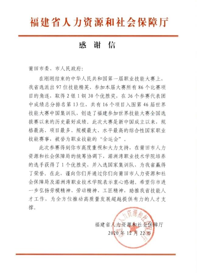 近日,福建省人力资源和社会保障厅向莆田市委、市人民政府转来感谢信,信中对我院办学成效及学生叶祖彪在首届全国职业技能大赛上取得优秀成绩表示感谢。