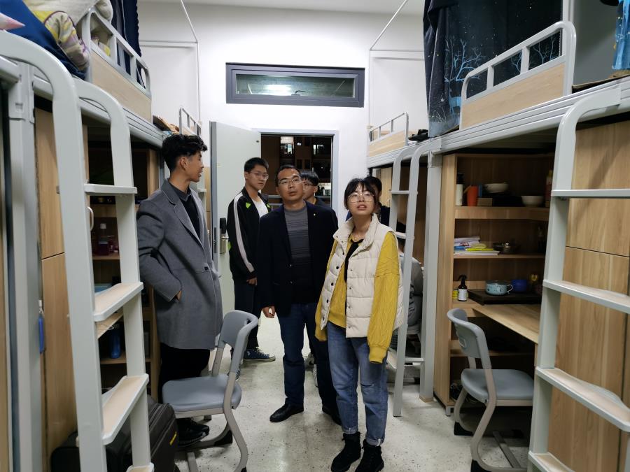 在走访过程中,陈建武书记细致地询问学生返校事宜和开学准备,详细地了解学生宿舍消毒用品、口罩等疫情防控物质配备情况。他亲切地与学生进行交流,询问学生学习和生活等情况,认真听取学生反馈的宿舍报修问题,安排同学拍照记录下来,他表示大家有问题可以及时向院系反应,院系会帮助大家解决难题。并叮嘱同学们在平常的生活中,要提高疫情防控意识,整理好内务,注重个人卫生和宿舍环境卫生,同时不断提醒同学们要时刻注意人身财产安全、用电安全,调整好心态,合理作息,以饱满的热情投入到新学期的学习生活中去。